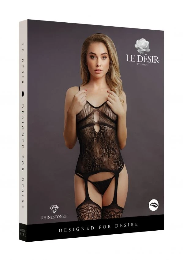 Ce bodystocking sublime les courbes du corps avec une résille fine qui en suit les lignes. Ses bretelles fines laissent les épaules nues. Des ouvertures en gouttes mettent en lumière le décolleté. Une découpe à l’entrejambe offre un effet porte-jarretelles dont les bas habillent les jambes. Le haut des cuisses est paré d’une dentelle florale qui forme une jarretière et illuminé de strass blancs. Taille unique, sa matière douce et élastique est faite pour s’adapter aux courbes du corps. Sa résille fine est très douce et résistante, assurant son confort et sa durabilité.