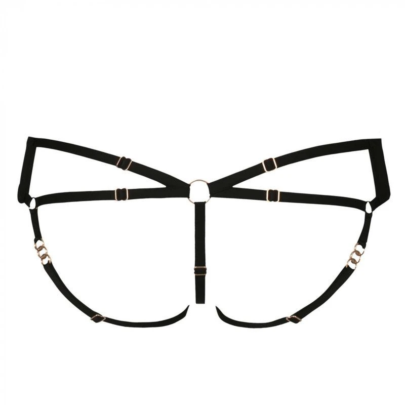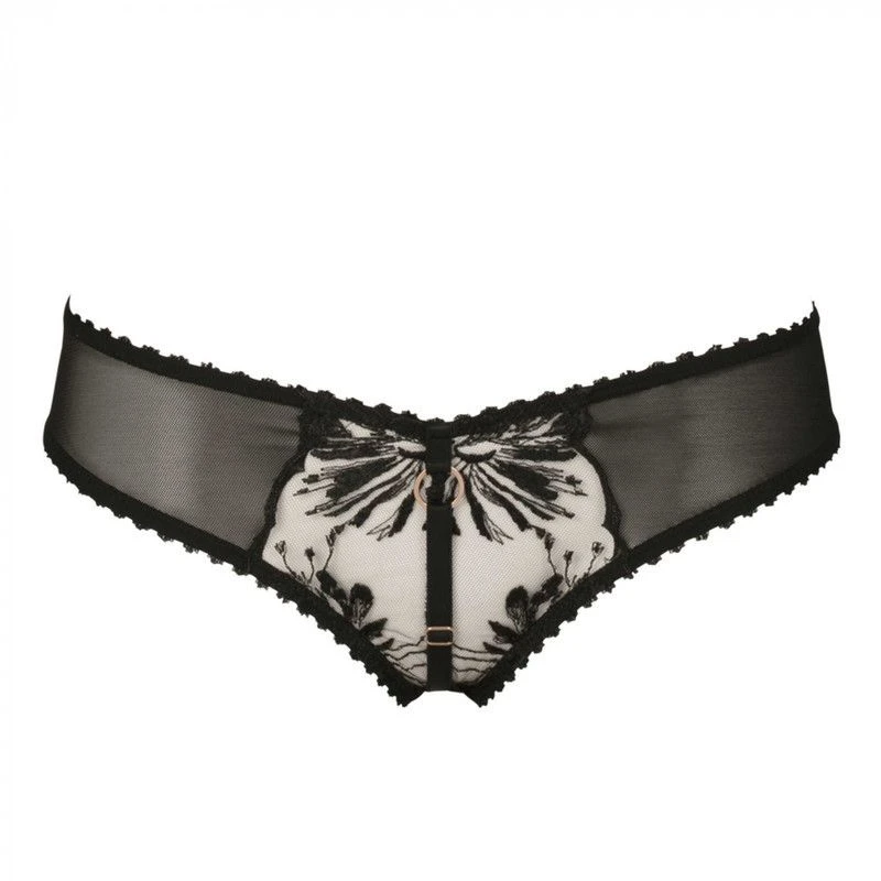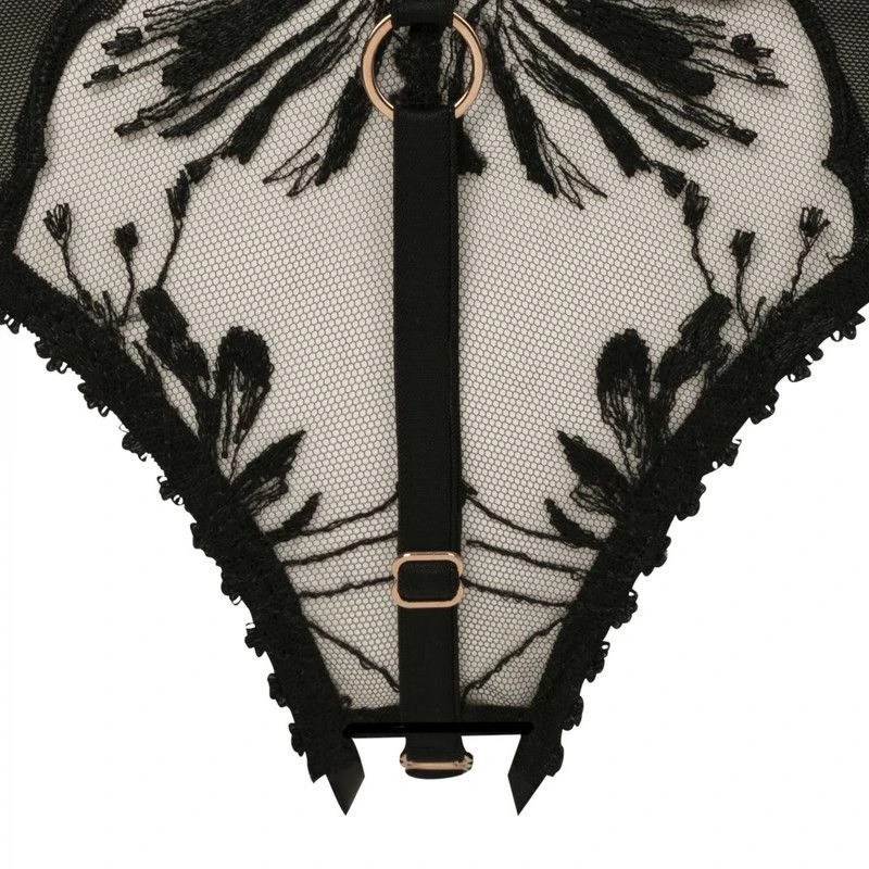 Entre résille et tulle brodé sur l’avant, cette culotte habille la peau d’un motif floral harmonieux. Sa résille noire transparente sublime les hanches et contraste avec le motif de fleurs tout en douceur. Une lanière annonce le ton en ajoutant d’ores et déjà une touche un peu plus exentrique. Partant du centre de la culotte, elle longe l’entrejambe… Le dos de la culotte est quant à lui remarquable. Composé d’un jeu d’élastiques réglables, il habille les fesses d’un labyrinthe de lanières laissant le peau nue. Chaque élastique est ajustable et relié par des anneaux de couleur or rose.
