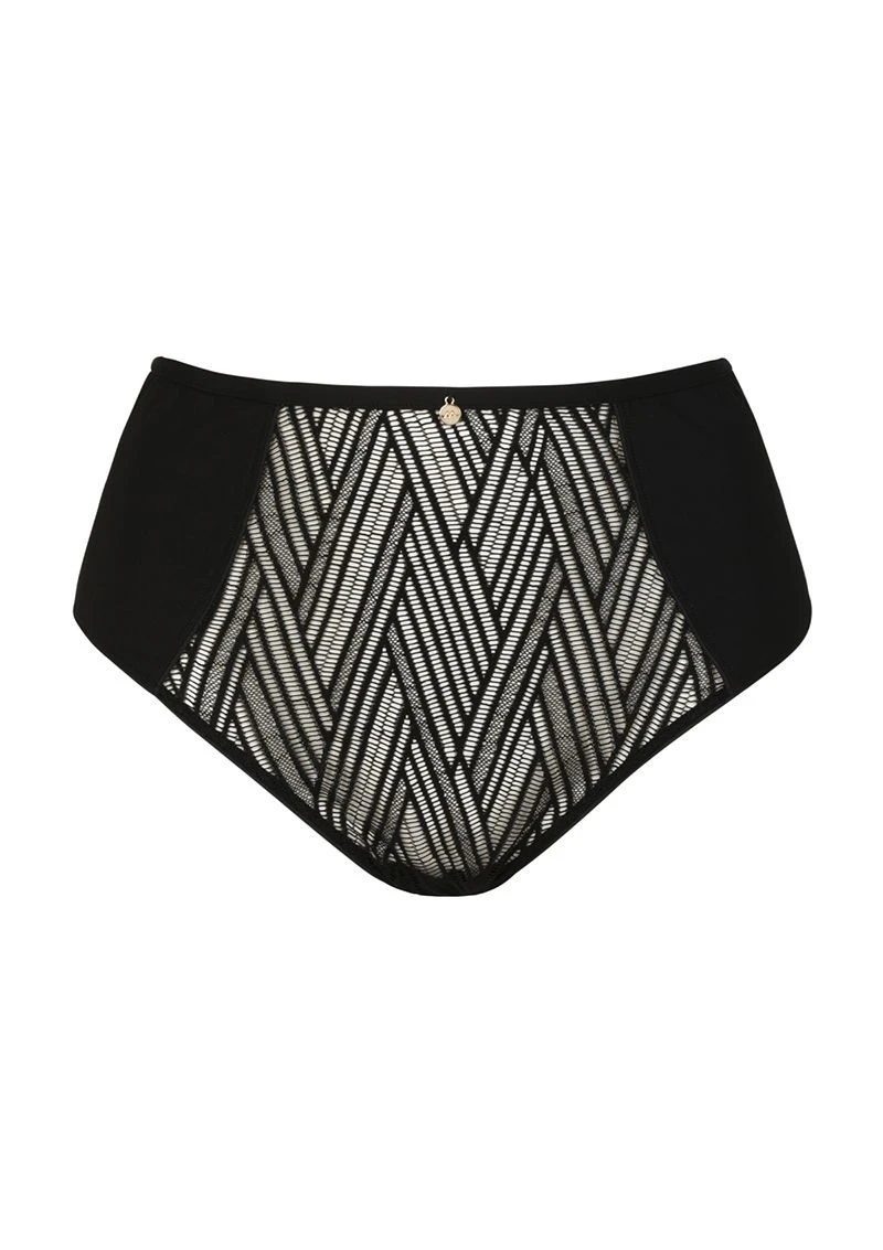 Cette culotte habille la peau d’une maille opaque et d’une dentelle graphique transparente. Son jeu de matière apporte une un effet structuré sur l’avant, soulignant les hanches. Les dos est encore plus dévoilé avec sa découpe sensuelle. Un bijou chaînette doré vient se loger au creux des reins et invite le regard.
