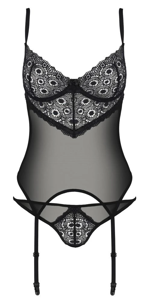 Tout en résille transparente et dentelle, cette guêpière dessine sur la peau un délicieux motif graphique. Son jeu de transparence dévoile la peau et souligne les courbes du corps. Son motif en V sous la poitrine accentue son décolleté et met en valeur la taille. Tout en jeu de transparence, cette guêpière habille le corps avec élégance.