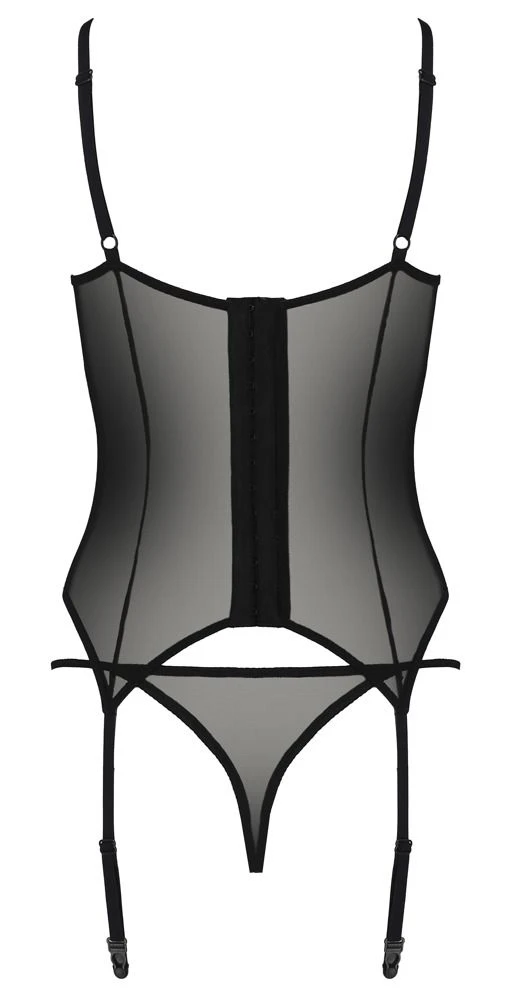 Cette guêpière souligne le décolleté avec sa coupe armaturée. Ses bonnets redessinent et redressent élégamment la poitrine. Son agrafage au dos permet de l’ajuster au mieux à chaque corps et souligne la taille. Ses bretelles fines ainsi que ses jarretières sont réglables pour s’adapter à chaque morphologie et tenue. Un string en dentelle et résille l’accompagne.
