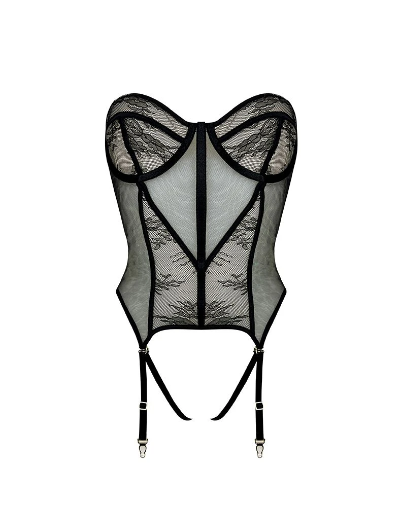 Dans un délicat mélange de dentelle florale, de tulle transparent et de soie, cette guêpière habille le corps et le déshabille à la fois. Son tulle transparent sous la poitrine accentue l’effet plongeant du décolleté. Ses attaches en acier plaquées or 24 carats contrastent avec son tissu transparent noir. Sa dentelle fine dessine un motif de fleurs sur les seins. Portée avec ses porte-jarretelles, elle devient pièce de séduction ultime dans l’intimité, tandis que sans, elle devient bustier à porter en soirée.