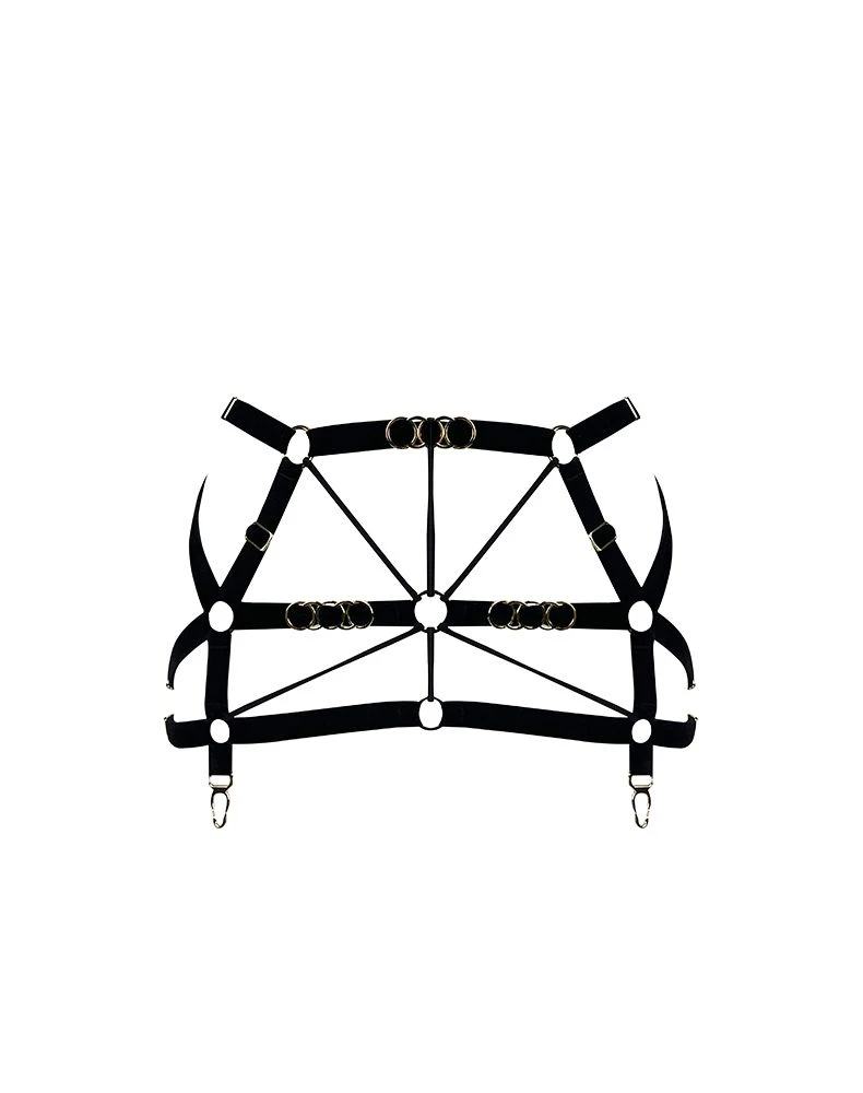 Tout en lanières, cette jupe porte-jarretelles se porte autant comme culotte ouverte que comme accessoire pour sublimer une parure de lingerie. Elle peut ainsi se porter sur un string ou un body pour un effet harnais. Ses porte-jarretelles permettent d’accrocher une paire de bas ou des jarretières. Mettez son jeu de lanières en lumière en le dévoilant sous une robe transparente. Et pour une parure complète, portez votre jupe avec le soutien-gorge Cage de la même collection. Son ouverture invite à la sensualité… Succombez aux effluves d’une brume intime ou laissez-vous tenter par la beauté d’un rosebud.