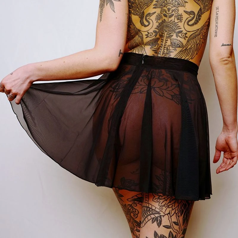 Tout en voile transparent, cette jupe habille le corps tout en le dévoilant. Portée nue, elle invite le regard. On se plaira à la porter sur une culotte en lanières ou un string à perles, ajoutant un effet déshabillé à votre parure. Un harnais de cuisses en cuir viendra souligner avec élégance les fesses ainsi dévoilées. Elle accompagnera également vos sorties du quotidien portée sur un short opaque.
