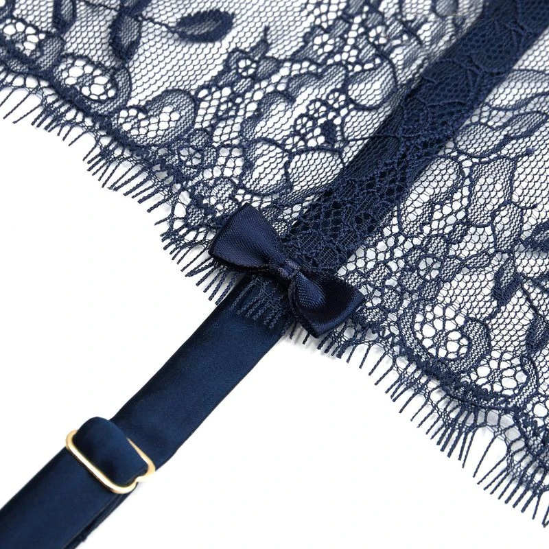 La collection Villa Satine marie la dentelle insolente avec le satin bleu profond pour créer des pièces de lingerie à la fois érotiques et voluptueuses.