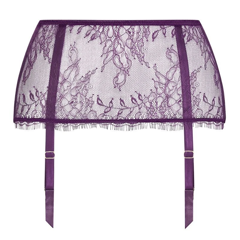MĂ©langeant un satin dĂ©licat et une dentelle florale, il joue Ă dĂ©voiler la peau en transparence. Les hanches et le ventre sont habillĂ©s d’une dentelle fine dont le motif apporte un esprit romantique. Son satin doux violet profond fait ressortir les attaches dorĂ©es des jarretelles. Ses baleines lui donne un effet corset qui structure la taille et tranche avec la transparence de la dentelle.Â