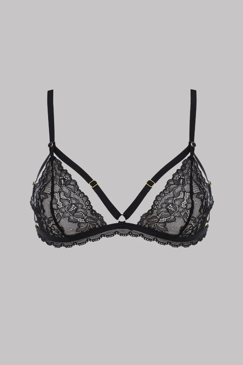 Pourvu d’accessoires dorés et conçu en dentelle noire élastique, ce soutien-gorge ouvrable par un bouton haut s’ajuste parfaitement aux courbes et offre un excellent confort.