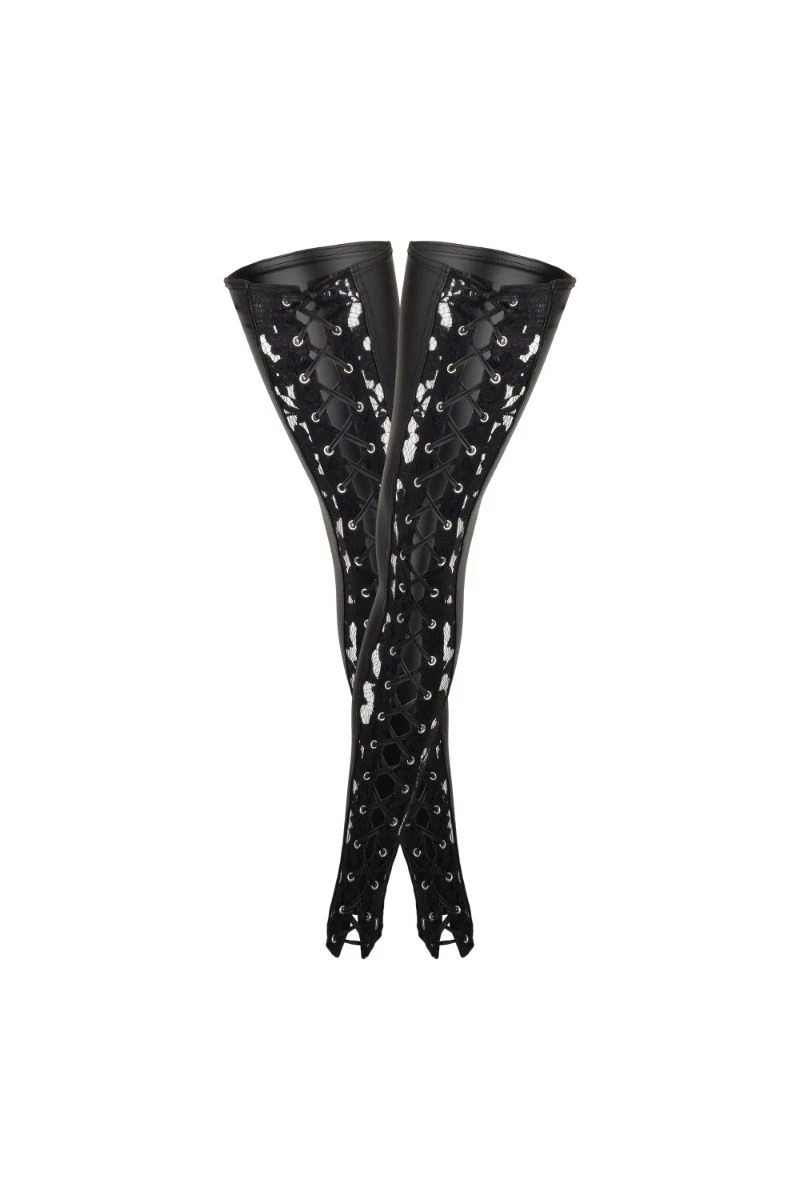 Entre les bas et le legging, ces jambières habillent la jambe depuis la cuisse jusqu’à la cheville. Composées d’un wetlook mat et d’une dentelle florale entrecoupée d’un laçage, elles parent la jambe avec grâce. Laissant le pied nu, elles se portent aussi bien avec des chaussures ouvertes que fermées. Sublimant une robe, elles peuvent également compléter un ensemble de lingerie tenues par un porte-jarretelles.