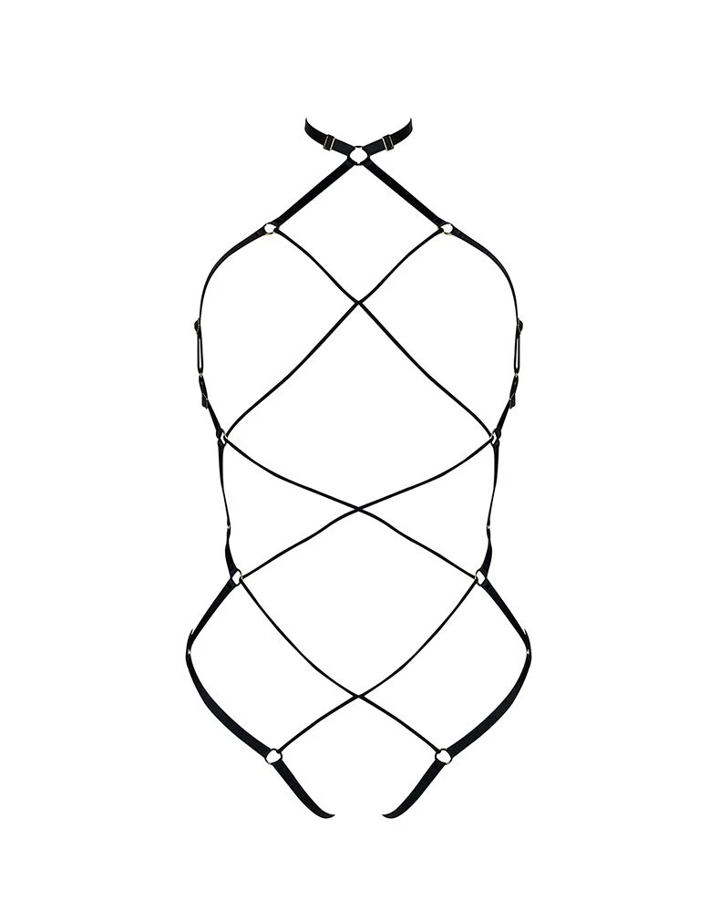 Cette playsuit se porte autant comme pièce de lingerie à part entière que comme harnais sur ou sous des vêtements. Elle s’accompagnera d’une paire de nippies et d’un string, ou sublimera un body. Cachée sous une veste ou une robe, elle invite le regard sans rien dévoiler. Ses ouvertures laissent quant à elles de nombreuses possibilités de jeu… On profite de la peau nue pour jouer avec les caresses d’une plume ou de pinces tétons. Ou on réchauffe la peau nue avec une huile chauffante.