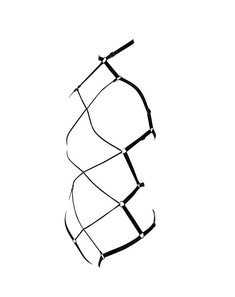 Intégralement ouverte, cette playsuit composée de lanières élastiques satinées suit les courbes du corps et redessine la silhouette. Inspirée de l’art érotique japonais du Shibari elle recrée sur la peau un jeu d’encordage. Son col montant donne un effet choker et laisse les épaules nues. Les lanières sont ajustables individuellement pour s’adapter au mieux à chaque morphologie. Ouverte sur la poitrine et l’entrejambe, ce body offre de nombreuses possibilités de combinaisons.