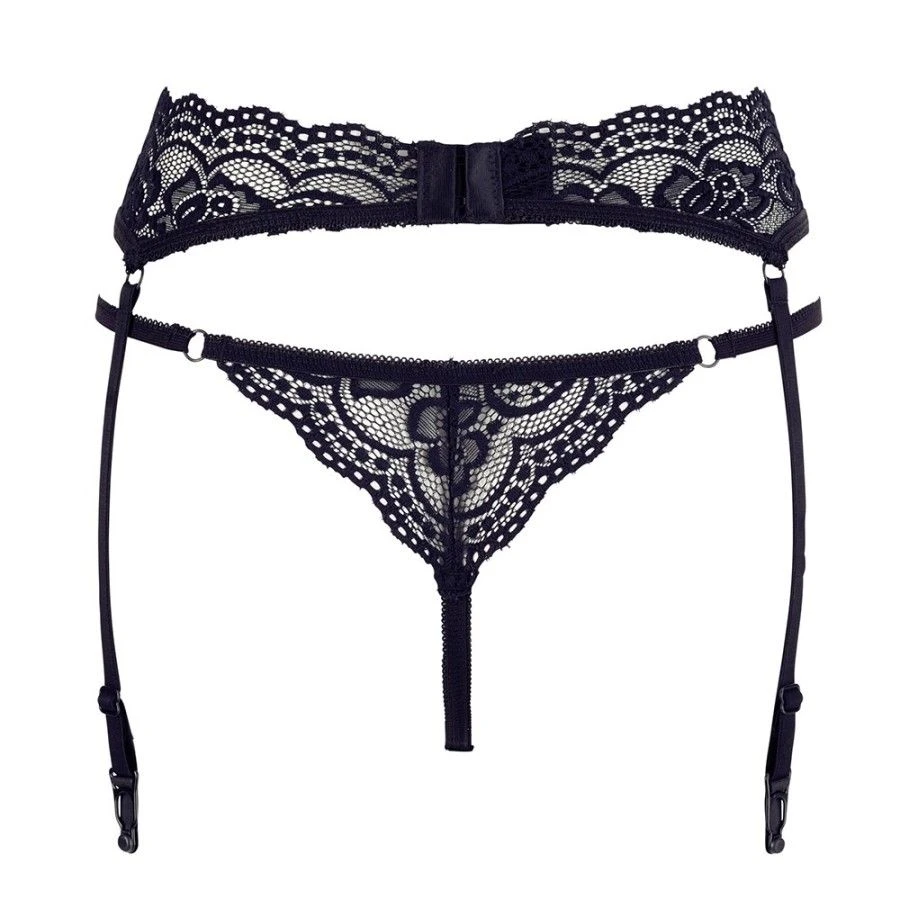 Ce porte-jarretelles est en dentelle fine qui dessine un motif floral sur les hanches. On le portera en parure avec un ensemble de lingerie en dentelle noire ou un harnais de poitrine et une paire de nippies. Ses attaches permettent de le porter avec tous les bas en voile.Â