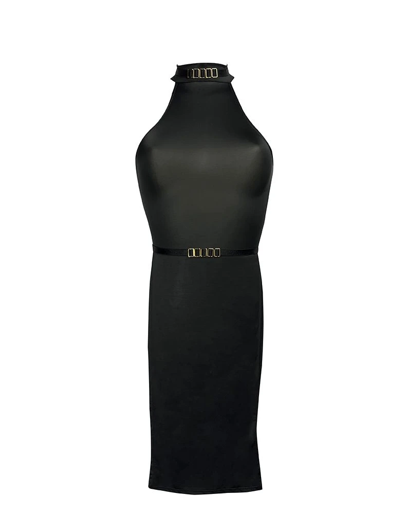 Cette robe se portera aussi bien nue qu’accessoirisée au gré des occasions. Ainsi, on jouera avec sa coupe ajourée qui dévoile les jambes sur toute leur longueur, invitant le regard sans rien dévoiler. On pourra ainsi les habiller de collants résille ou d’un harnais de cuisse. Le décolleté pourra être orné de bijoux de seins ou d’un harnais de poitrine qui en soulignera élégamment le contour. Dans l’intimité ou en soirée, cette robe trouve sa place en toute occasion.