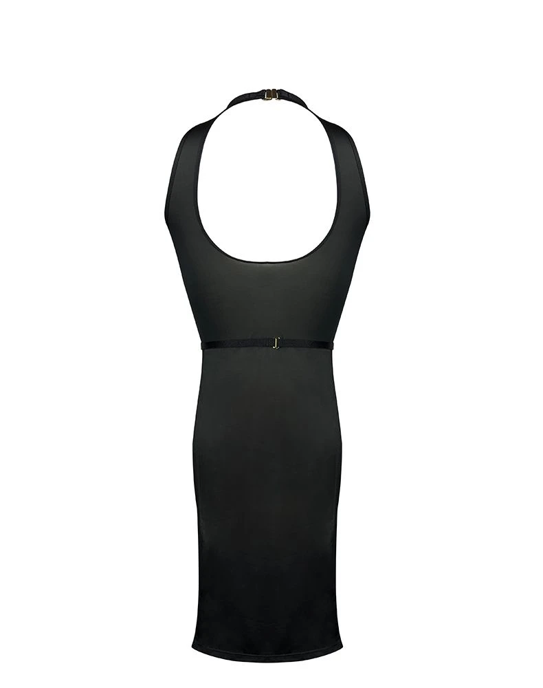 Avec son col montant, cette robe habille le corps tout en légèreté. Les épaules et le haut du dos sont laissés nus tandis que la poitrine est soulignée délicatement. Sa ceinture fine marque la taille et l’orne de bijoux. Fendue sur les hanches, elle dévoile les jambes et les allongent tout en offrant un effet habillé-déshabillé des plus sensuels.