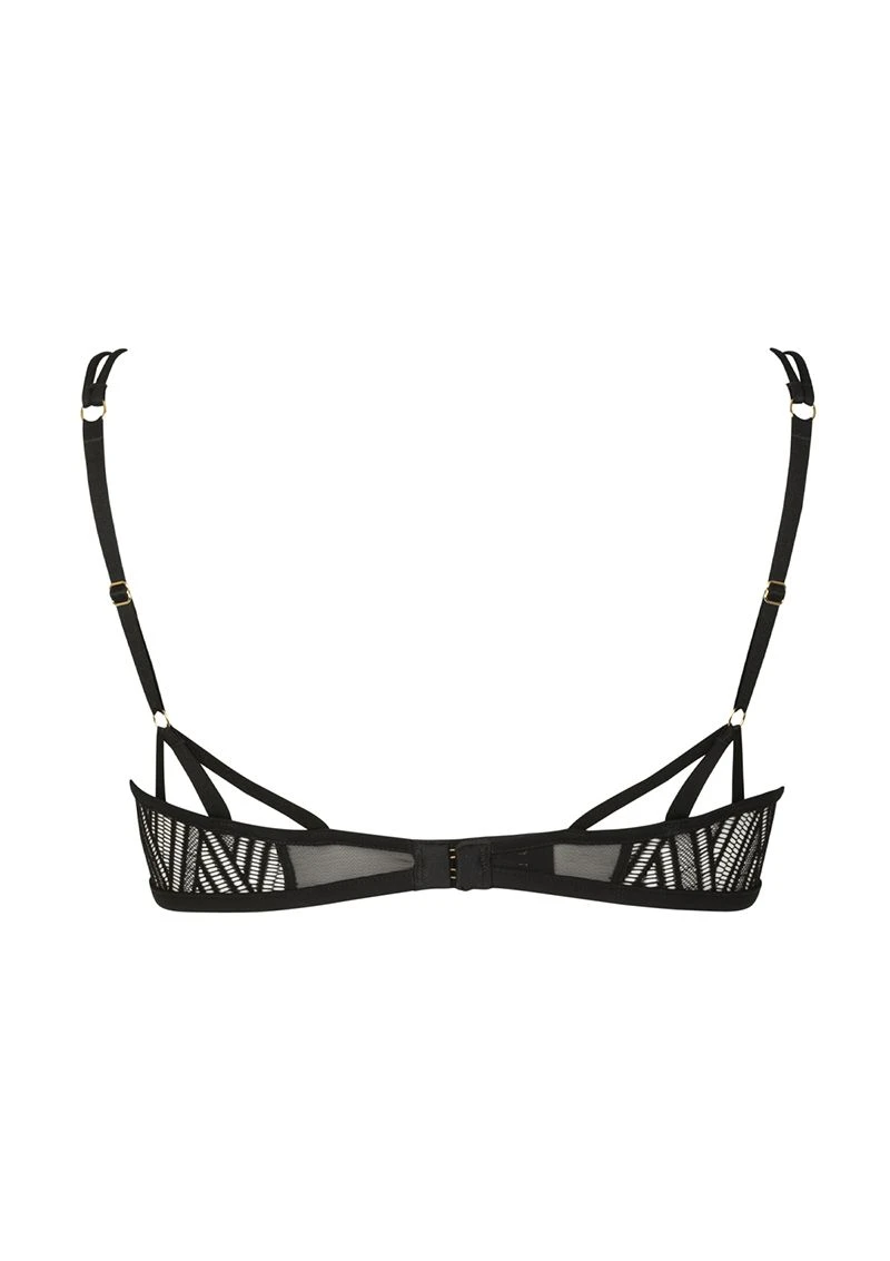 Ce soutien-gorge joue avec les matières pour le plus grand plaisir des yeux. Il mélange ainsi une dentelle graphique ajourée, un tulle transparent et une maille opaque. Son mélange de matière souligne le galbe de la poitrine et dévoile le sein tout en élégance. Les chaînes dorées habillent les épaules et intensifie le côté bijou de ce soutien-gorge.