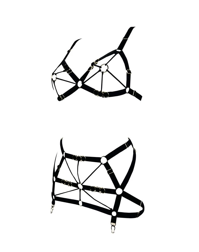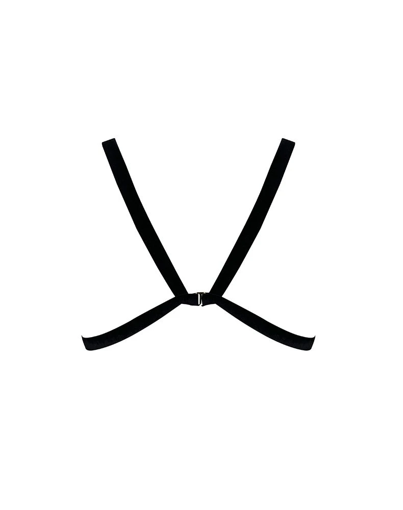 Intégralement ouvert, ce soutien-gorge composé de lanières élastiques satinées et de velours suit les courbes du corps et redessine la poitrine. Inspiré de l’art érotique japonais du Shibari il recrée sur la peau un jeu d’encordage. Les lanières sont ajustables individuellement pour s’adapter au mieux à chaque morphologie. Ses anneaux centraux viennent orner le téton et le stimulent avec une délicate sensation de contrainte. Ses bretelles se ferment au dos grâce à un crochet, laissant les épaules et la nuque dénudés. Tout en noir et or, il met en valeur toutes les carnations.