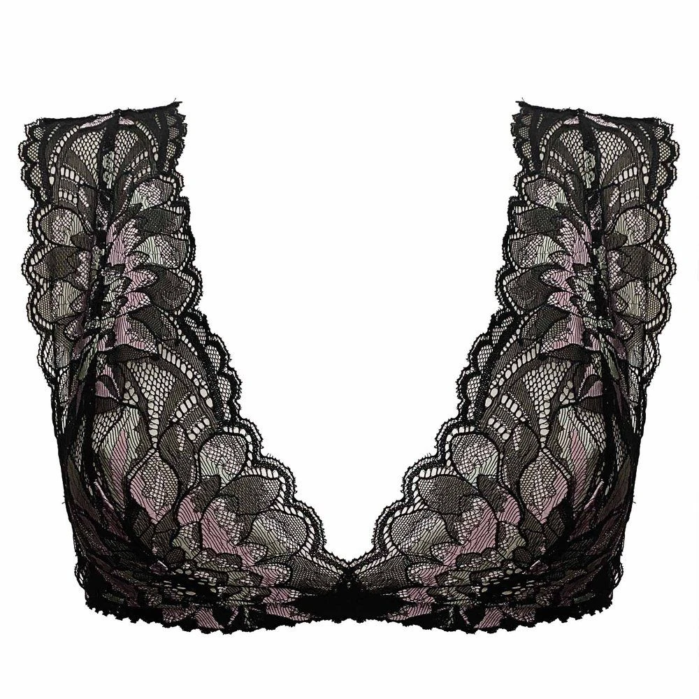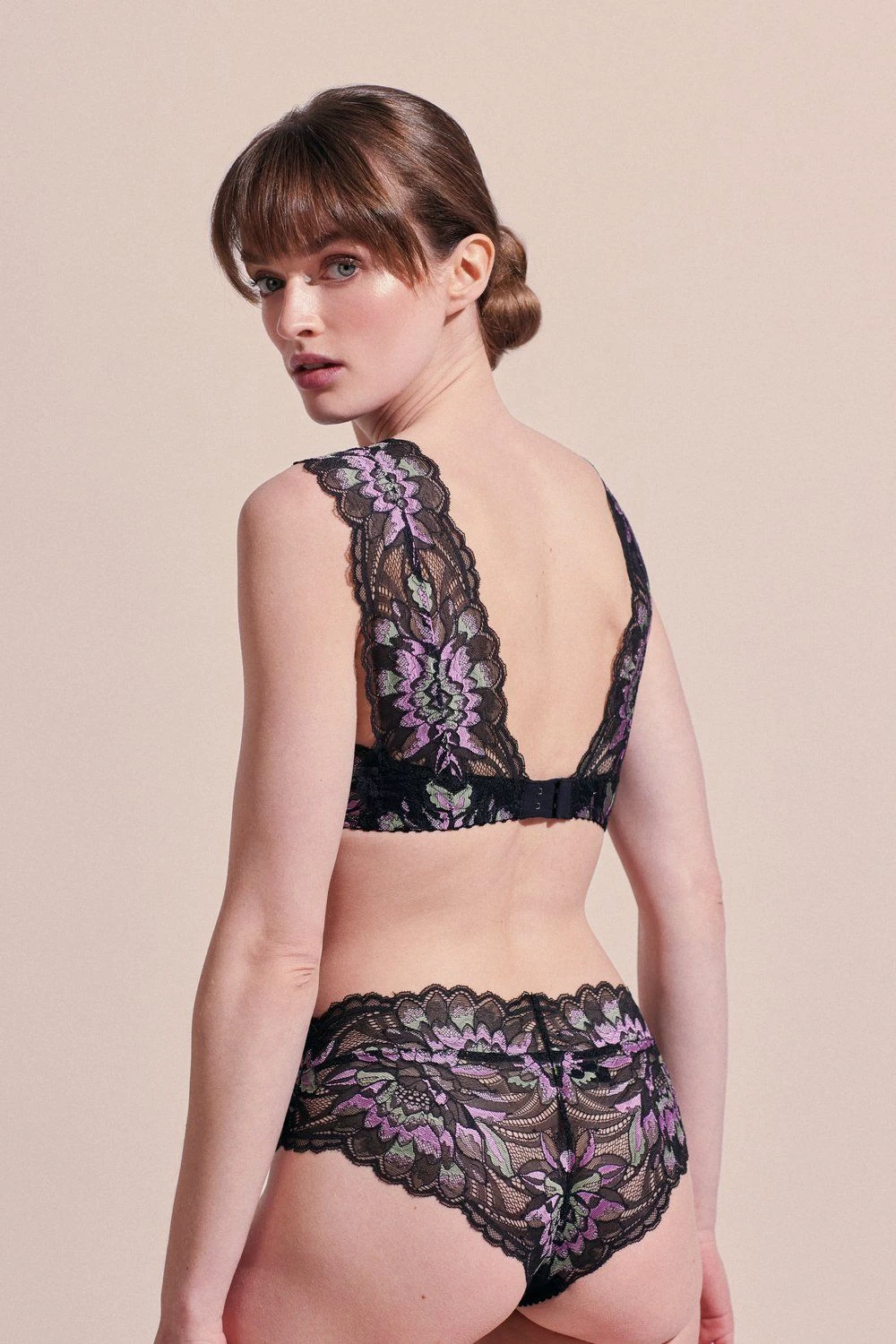 Tout en dentelle, ce soutien-gorge habille la peau d’un délicat motif de fleurs. Le décolleté est dévoilé par sa coupe plongeante tandis que les épaules et le dos sont parés de dentelle. Cette dernière dessine sur la peau un large motif de fleurs en rose et vert. A la fois coloré et irisé, ce soutien-gorge sublime la poitrine.
