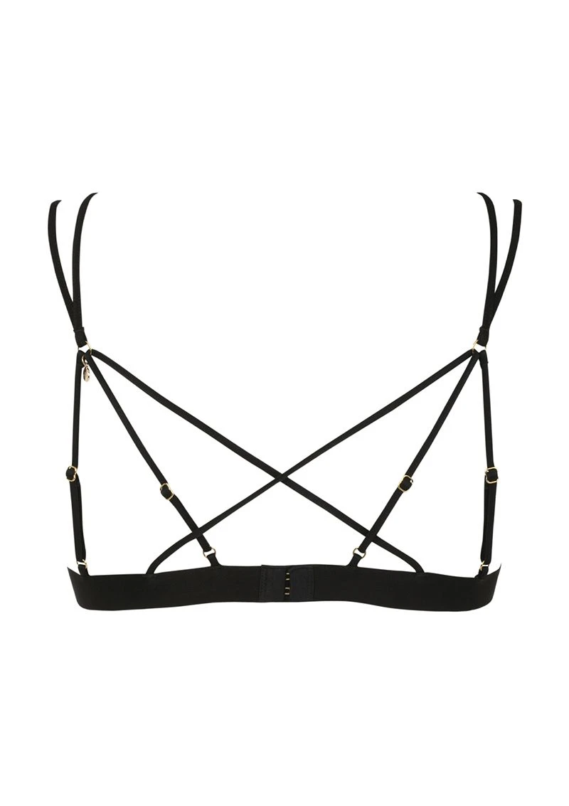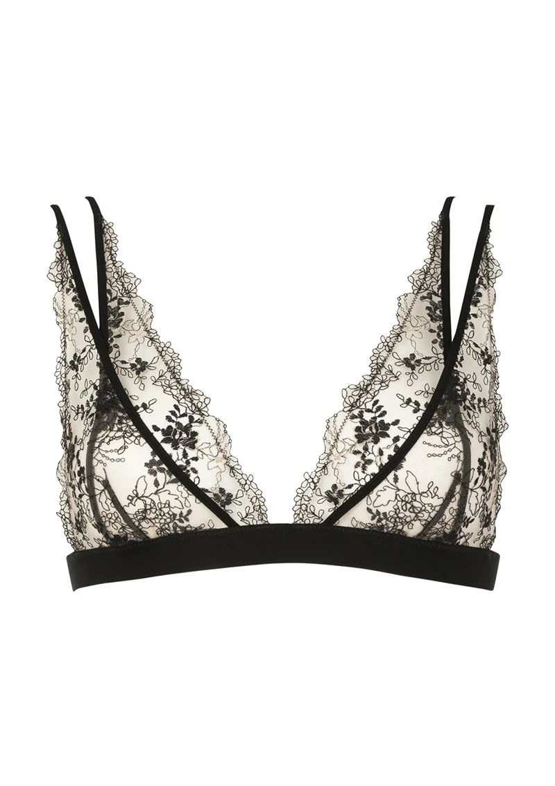 Ce soutien-gorge a une coupe triangle, sans armature, il soutient la poitrine avec légèreté. Deux pans de tulle se superposent sur la poitrine, la laissant dévoilée en transparence. Une bande élastique large passe sous le sein, apportant un léger maintien. Un jeu de laçage habille le dos et permet de l’ajuster parfaitement à chaque corps. Chaque lanière est réglable grâce à une petite attache dorée, qui confère un effet bijou à cette pièce de lingerie.